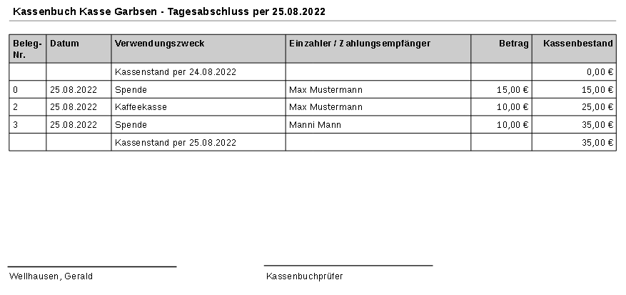 Gibt den Kassenstand über alle geführten Kassenbücher in Summe an. Die Beträge, ob Einzahlung oder Auszahlungen werden in der gleichen Spalte verrechnet.